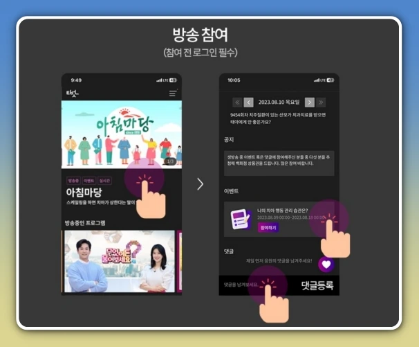 - 메뉴에서 아침마당을 선택하면 참여 준비 완료
