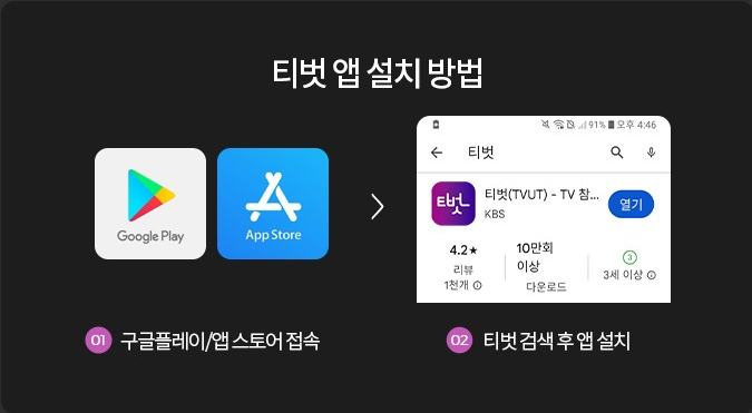 - 구글 플레이 스토어 또는 애플 앱스토어에서 “티벗” 검색