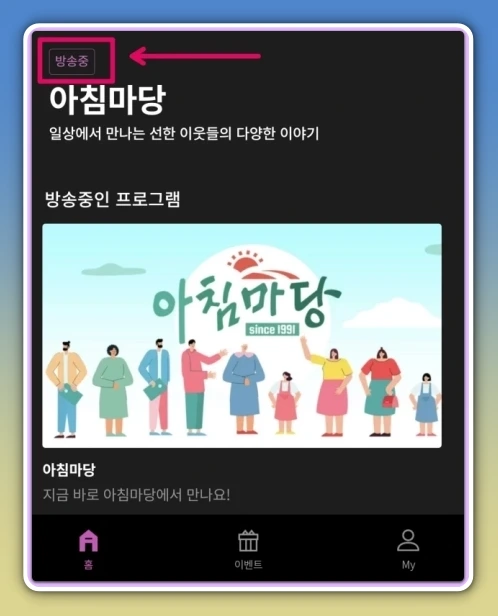 - 메뉴에서 아침마당을 선택하면 참여 준비 완료